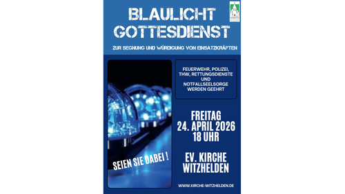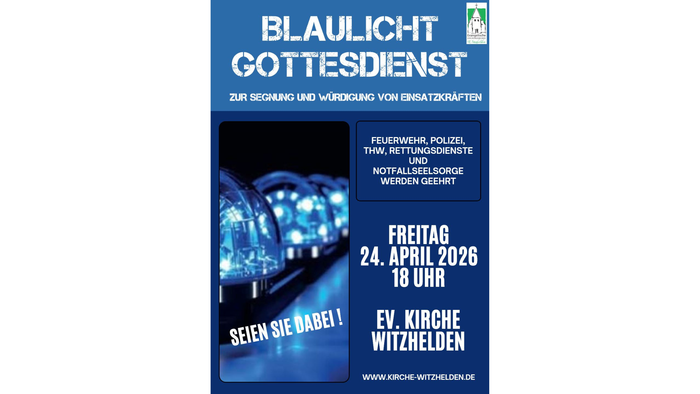 Die Evangelische Kirchengemeinde Witzhelden lädt am Freitag, 24. April 2026 um 18:00 Uhr in die Evangelische Kirche herzlich zu einem Blaulichtgottesdienst ein. Eingeladen sind neben den aktiven Einsatzkräften auch deren Familien sowie ausdrücklich alle Bürgerinnen und Bürger, die ihre Wertschätzung und Solidarität zeigen möchten.