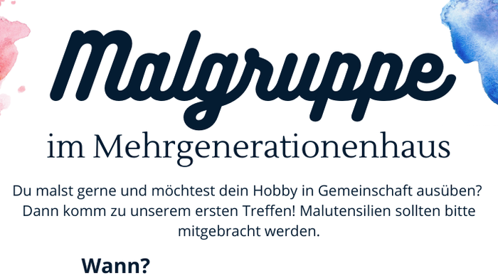 Jeden letzten Freitag im Monat trifft sich unsere Malgruppe ab 17 Uhr im Mehrgenerationenhaus/EKi-Haus. Materialien, Malutensilien etc. sollten zu diesem Termin mitgebracht werden. Es werden leider keine Materialien gestellt. In den Ferien und an Feiertagen pausiert das Angebot.
