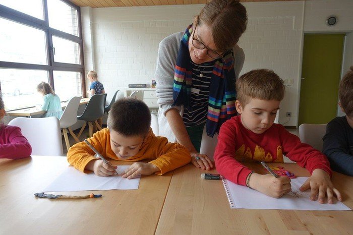 Die Lerchenweg-Kita ist auf dem besten Weg, ein waschechter Rheinkiesel zu werden. Die Erzieherin Birgit Ouwenbroek bringt den Stein ins Rollen und koordiniert die verschiedenen Module. Ein Programmpunkt ist die Geschichtenwerkstatt. Theaterpädagogin Jana Standop gestaltet mit 22 Kindern Sinnesbücher. Jede Seite offenbart einen phantastischen Kosmos, bevölkert von Einhörnern, Schnecken, Dinosauriern. Ein Rausch an Farben, Stoffen und Formen. Zuerst formen die Kinder Figuren ihrer Lieblingstiere, dann zeichnen sie sie ab, erfinden Geschichten und füllen Seite für Seite.