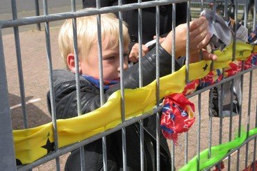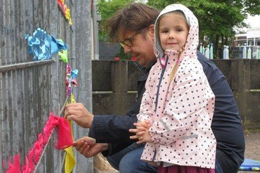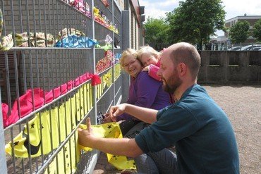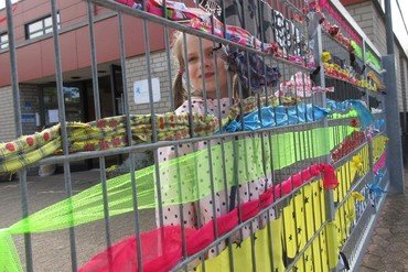 Nur wenige Kinder können zu Zeit IN die Kita kommen, aber Vorbeischauen können alle. So entstand die Idee, Zaun und Tor modisch einzukleiden, denn Kleider machen bekanntlich Leute und nicht nur…… Mit Knoten, Verweben und Geschick entsteht ein Netz aus Stäben und Stoffen. Hingucker und Symbol zugleich. Denn so bunt und schrill das Tor sein neues Kleidchen präsentiert, so eng leuchtend halten wir Kontakt zu den Kindern. Das bunte Gewand steht für Regenbogen und Auf Wiedersehen.
