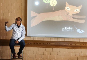 Die Eintrittskarte kontrolliert. Platz gesucht. Deckenlampen aus, Gardinen zu. Beamer an. Und schon ist die Kita ein Kino. Nur dass der Mann auf dem Barhocker nicht den Film am Klavier begleitet, sondern mit Gebärden. Kenneth-Kamal Seidel sitzt schon zum zweiten Mal in exponierter Stelle neben der Leinwand. Die Gäste sind zwölf Kinder der Kita Lerchenweg. Hinter den Kindern sitzt die „Filmvorführerin“ Isabel Helmerichs, an Tablet und Beamer. Sie projiziert ein Bilderbuch auf die Leinwand, Seite für Seite und liest vor: „Lauf nach Haus kleine Maus, lauf so schnell du kannst“. Kenneth Seidel bewegt seine Hände und übersetzt das gesprochene Wort in Gebärden. Seine sorgenvollen Stirnfalten unterstreichen die Angst der kleinen Maus, die nachts durch den Wald läuft und gefährliche Tiere trifft. Das Publikum ist erleichtert, als am Ende der Geschichte die kleine Maus zu ihrer Familie zurückfindet. Danach wird noch einmal rekapituliert, welche Tiere der Maus begegnet sind, zweisprachig: in Lautsprache und Gebärdensprache.