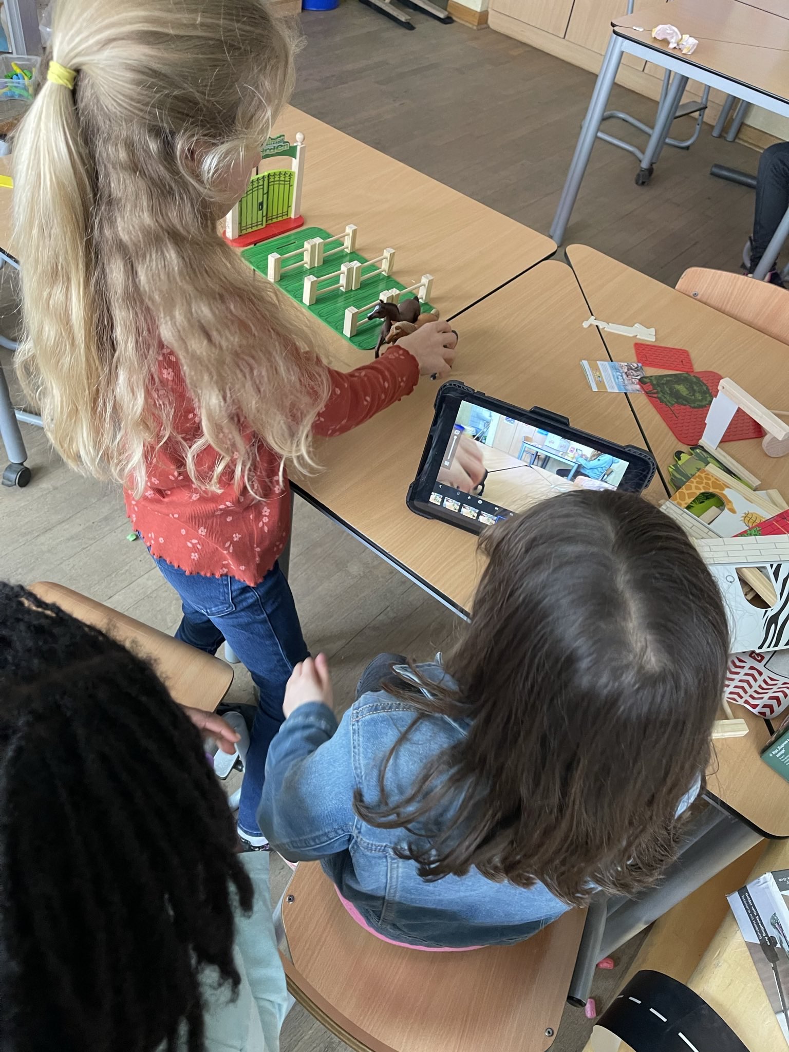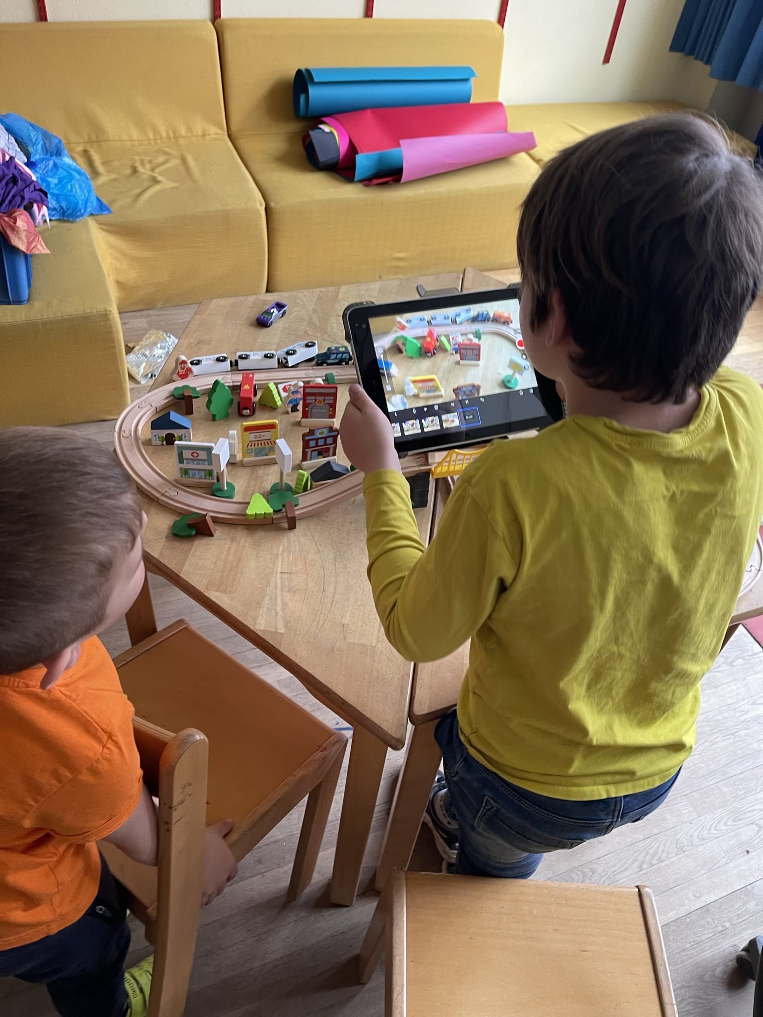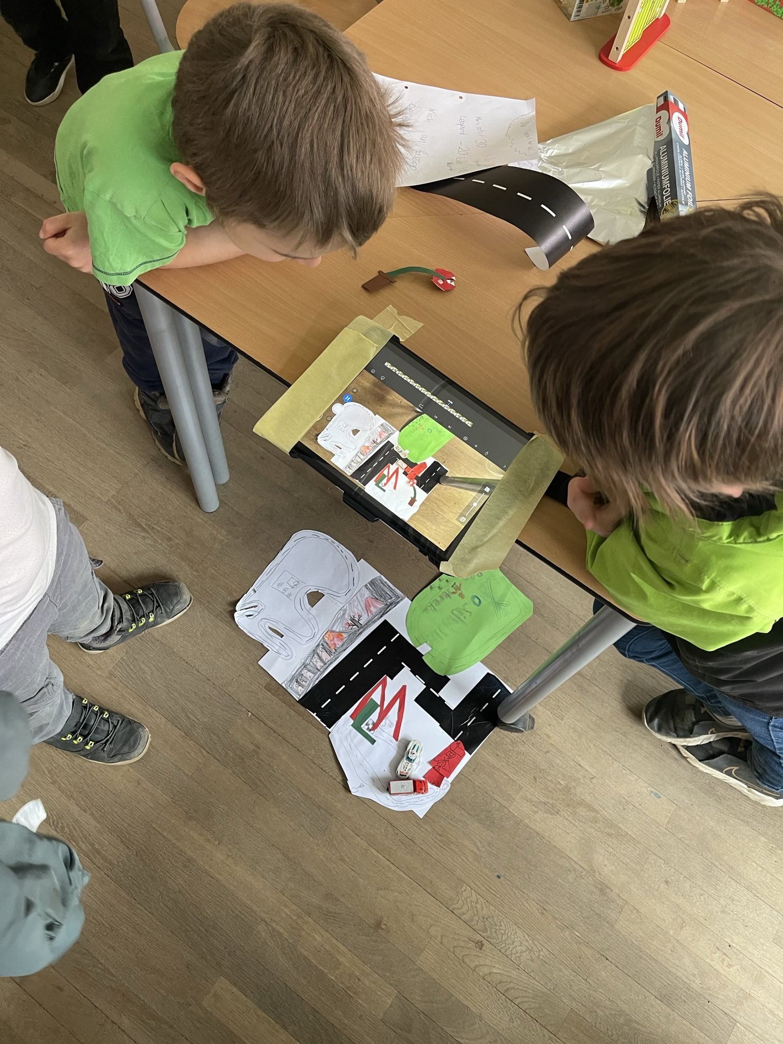 Die Kinder haben ihrer Phantasie freien Lauf gelassen und sind kreativ in der Umsetzung ihrer Ideen geworden. In kleinen Gruppen haben sie sich gemeinsam eine Filmidee überlegt, geplant wie sie diese auf die Leinwand bringen wollen und dann die Kulissen hergestellt. Danach ging es direkt los mit den ersten Fotos für den eigenen Stop-Motion-Film. Als alle Fotos gemacht waren, ging es an die Tonaufnahmen.